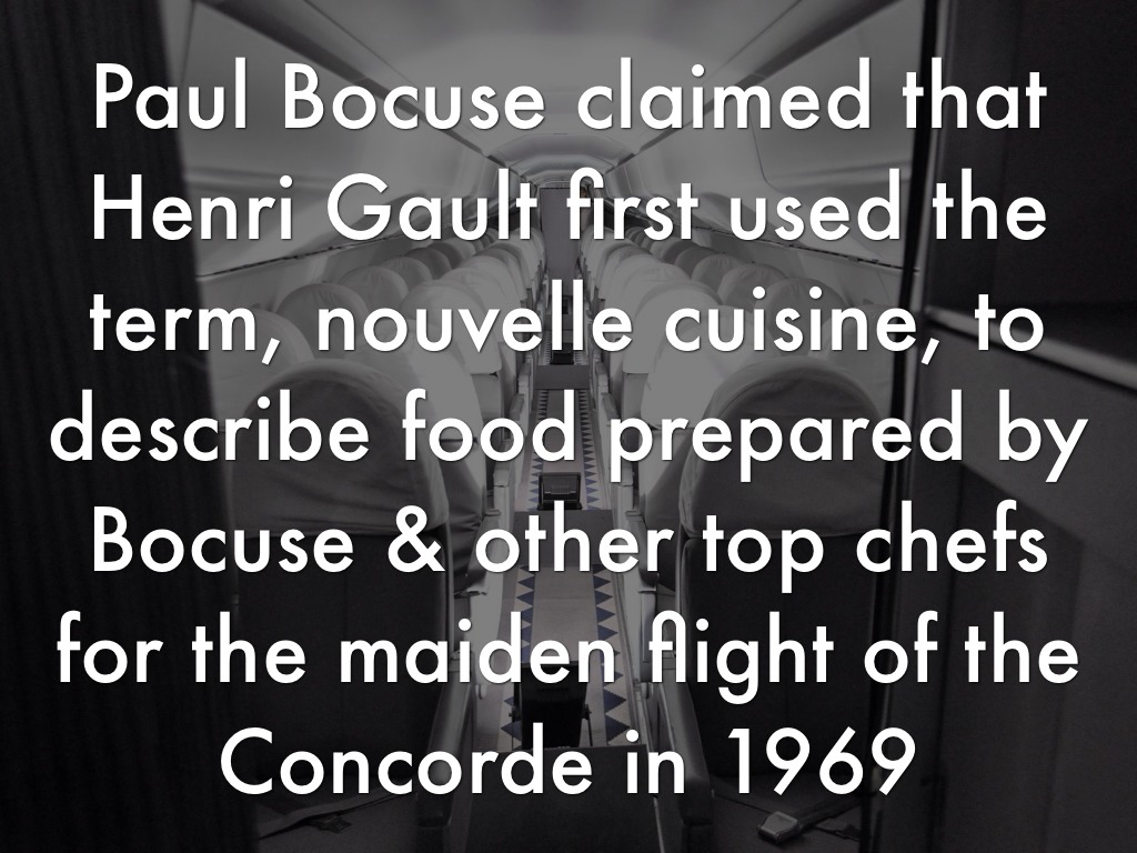 Paul Bocuse claimed that Henri Gault first used the term, nouvelle cuisine, to describe food prepared by Bocuse & other top chefs for the maiden flight of the Concorde in 1969