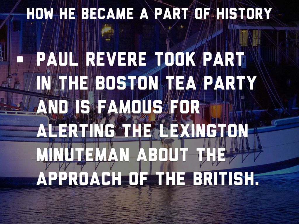 Paul revere took part in the Boston tea party and is famous for alerting the Lexington minuteman about the approach of the British.