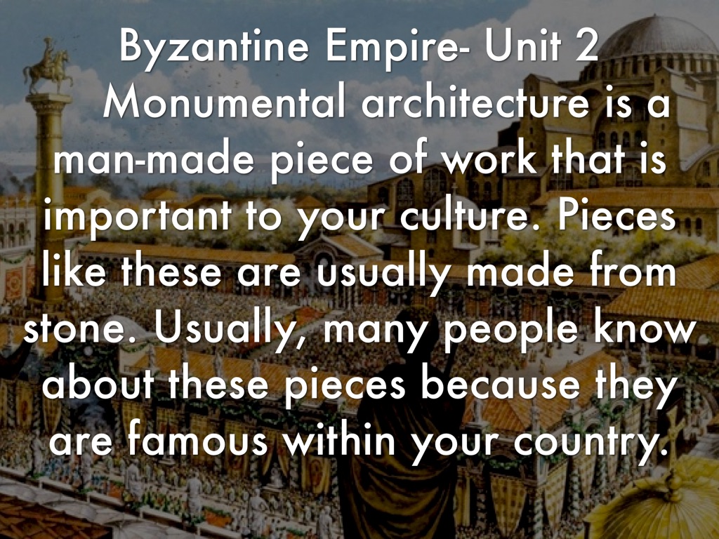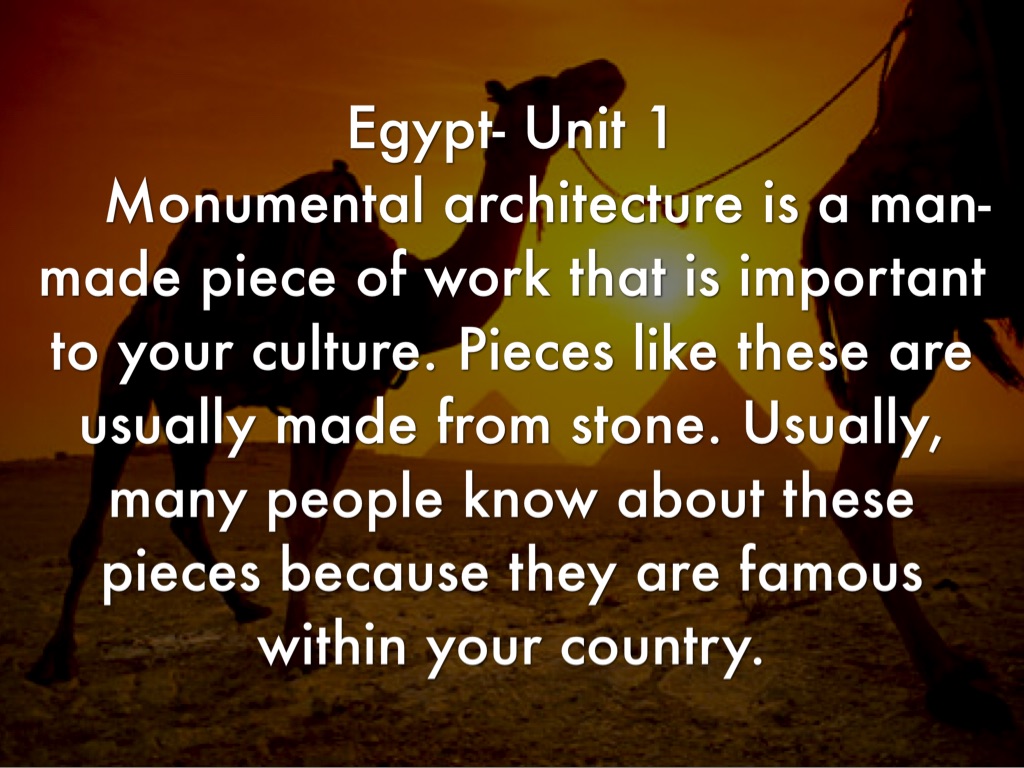 Monumental architecture is a man-made piece of work that is important to your culture. Pieces like these are usually made from stone. Usually, many people know about these pieces because they are famous within your country.
