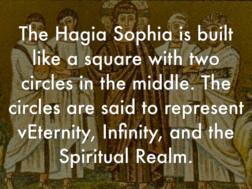 The Hagia Sophia is built like a square with two circles in the middle. The circles are said to represent vEternity, Infinity, and the Spiritual Realm.
