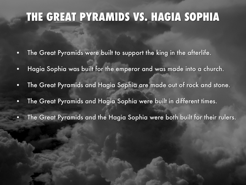 - The Great Pyramids and the Hagia Sophia were both built for their rulers.