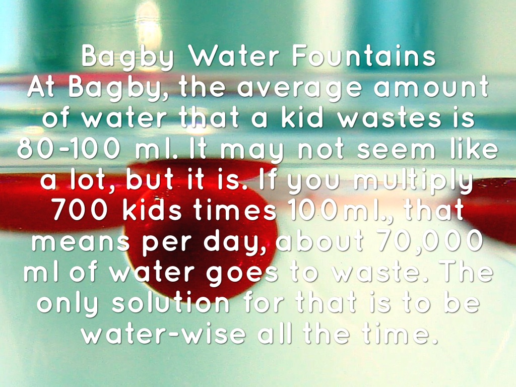 Bagby Water Fountains At Bagby, the average amount of water that a kid wastes is 80-100 ml. It may not seem like a lot, but it is. If you multiply 700 kids times 100ml., that means per day, about 70,000 ml of water goes to waste. The only solution for that is to be water-wise all the time.