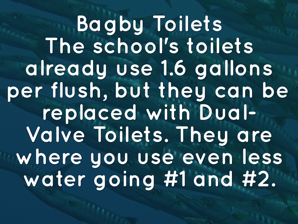Bagby Toilets The school's toilets already use 1.6 gallons per flush, but they can be replaced with Dual- Valve Toilets. They are where you use even less water going #1 and #2.