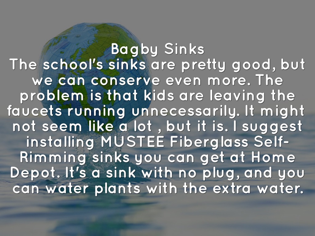 Bagby Sinks The school's sinks are pretty good, but we can conserve even more. The problem is that kids are leaving the faucets running unnecessarily. It might not seem like a lot , but it is. I suggest installing MUSTEE Fiberglass Self-Rimming sinks you can get at Home Depot. It's a sink with no plug, and you can water plants with the extra water.