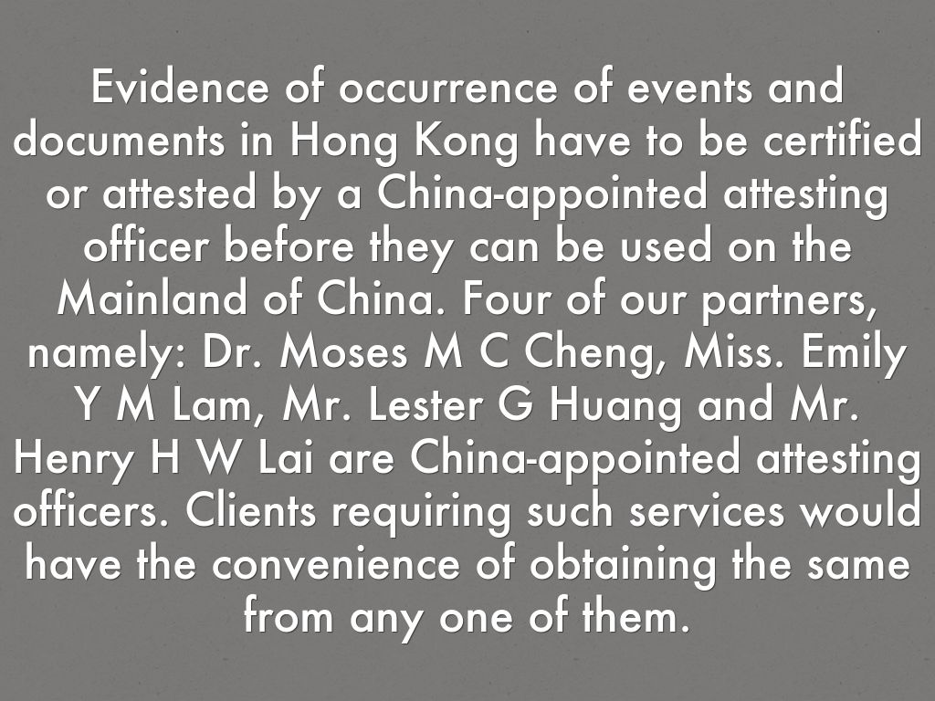 Evidence of occurrence of events and documents in Hong Kong have to be certified or attested by a China-appointed attesting officer before they can be used on the Mainland of China. Four of our partners, namely: Dr. Moses M C Cheng, Miss. Emily Y M Lam, Mr. Lester G Huang and Mr. Henry H W Lai are China-appointed attesting officers. Clients requiring such services would have the convenience of obtaining the same from any one of them.