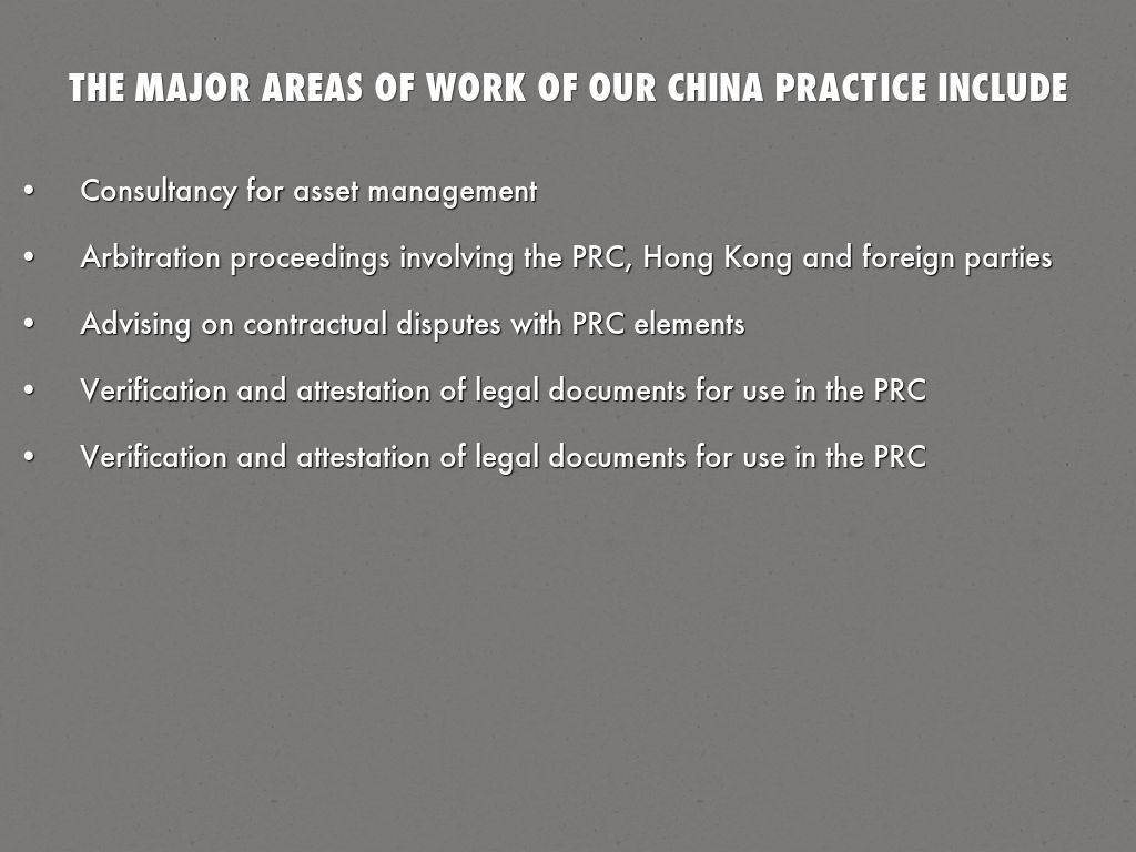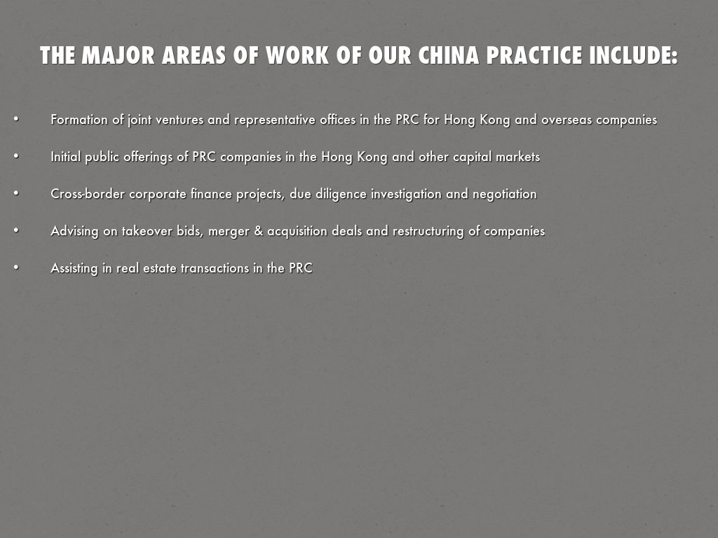 THE MAJOR AREAS OF WORK OF OUR CHINA PRACTICE INCLUDE
