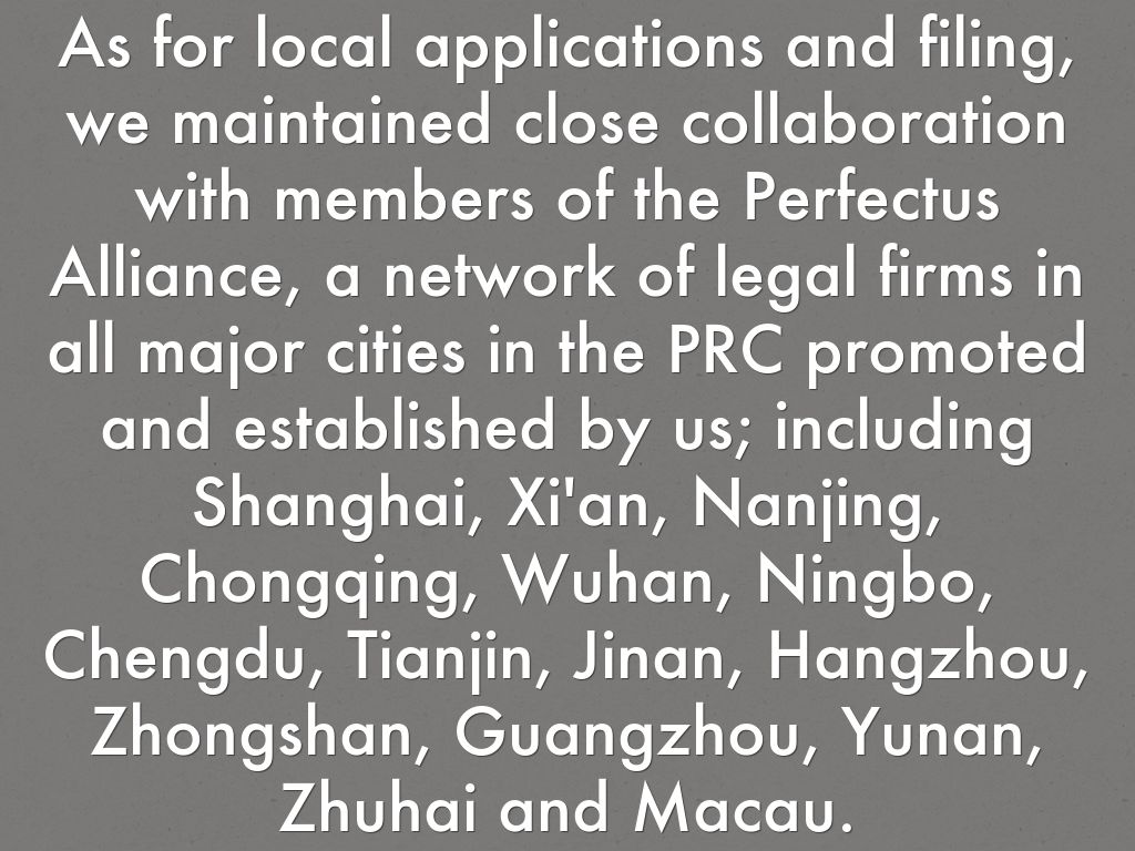 As for local applications and filing, we maintained close collaboration with members of the Perfectus Alliance, a network of legal firms in all major cities in the PRC promoted and established by us; including Shanghai, Xi'an, Nanjing, Chongqing, Wuhan, Ningbo, Chengdu, Tianjin, Jinan, Hangzhou, Zhongshan, Guangzhou, Yunan, Zhuhai and Macau.