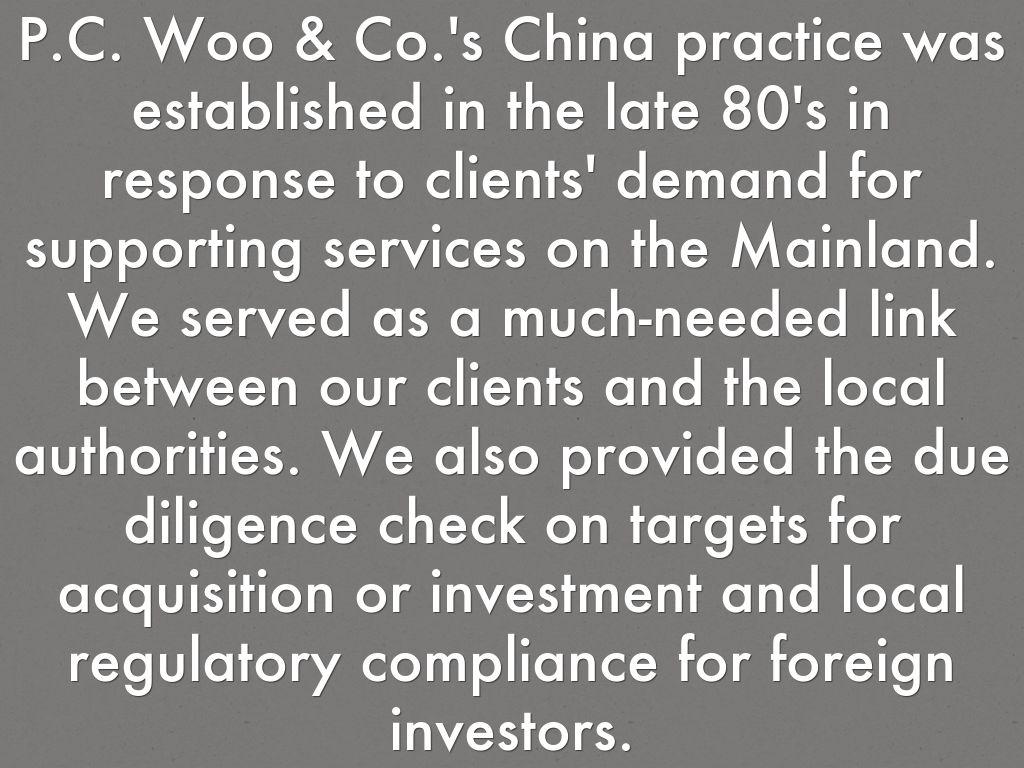 P.C. Woo & Co.'s China practice was established in the late 80's in response to clients' demand for supporting services on the Mainland. We served as a much-needed link between our clients and the local authorities. We also provided the due diligence check on targets for acquisition or investment and local regulatory compliance for foreign investors.