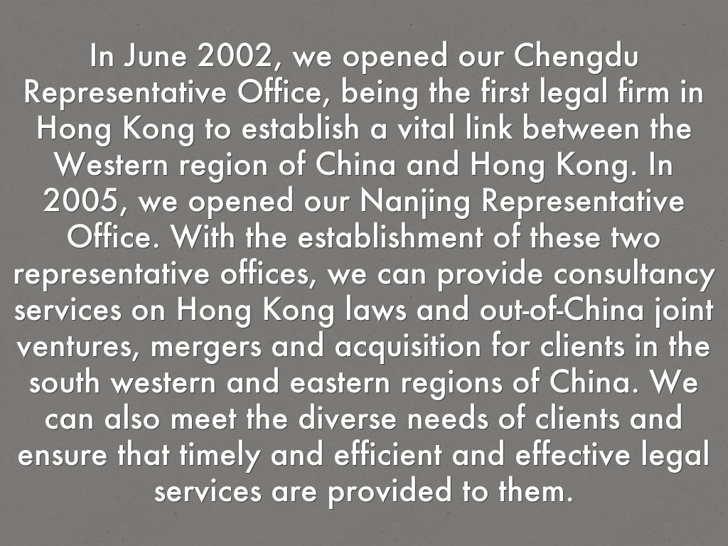 In June 2002, we opened our Chengdu Representative Office, being the first legal firm in Hong Kong to establish a vital link between the Western region of China and Hong Kong. In 2005, we opened our Nanjing Representative Office. With the establishment of these two representative offices, we can provide consultancy services on Hong Kong laws and out-of-China joint ventures, mergers and acquisition for clients in the south western and eastern regions of China. We can also meet the diverse needs of clients and ensure that timely and efficient and effective legal services are provided to them.