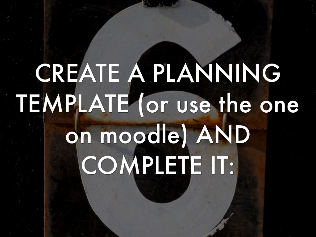 CREATE A PLANNING TEMPLATE (or use the one on moodle) AND COMPLETE IT: