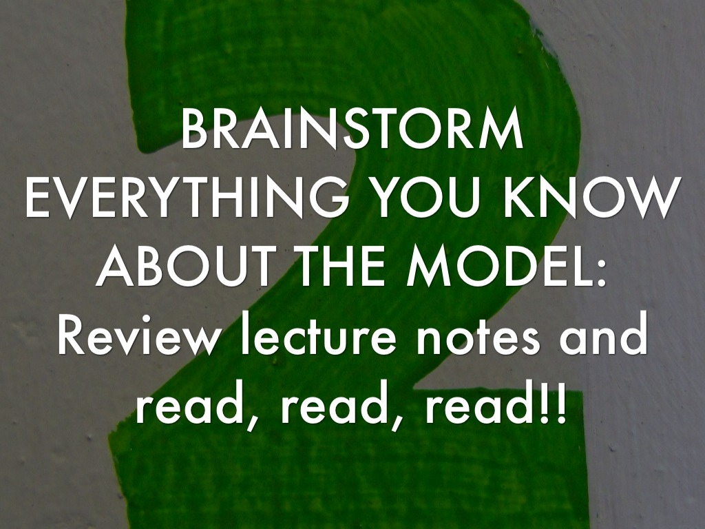 BRAINSTORM EVERYTHING YOU KNOW ABOUT THE MODEL: Review lecture notes and read, read, read!!