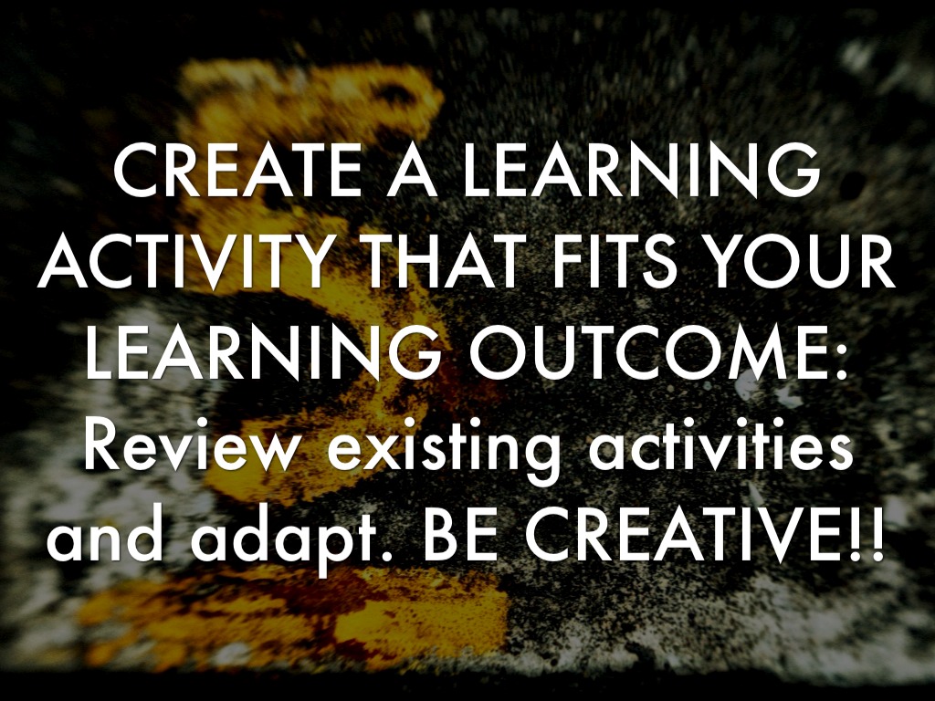 CREATE A LEARNING ACTIVITY THAT FITS YOUR LEARNING OUTCOME: Review existing activities and adapt. BE CREATIVE!!