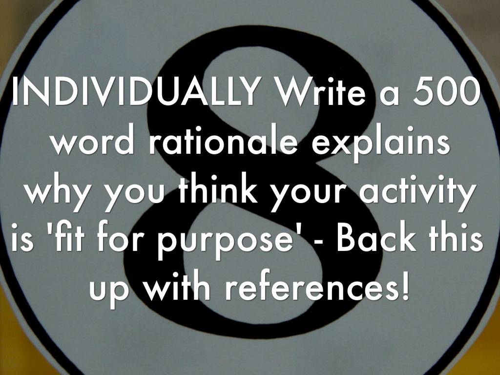 INDIVIDUALLY Write a 500 word rationale explains why you think your activity is 'fit for purpose' - Back this up with references!