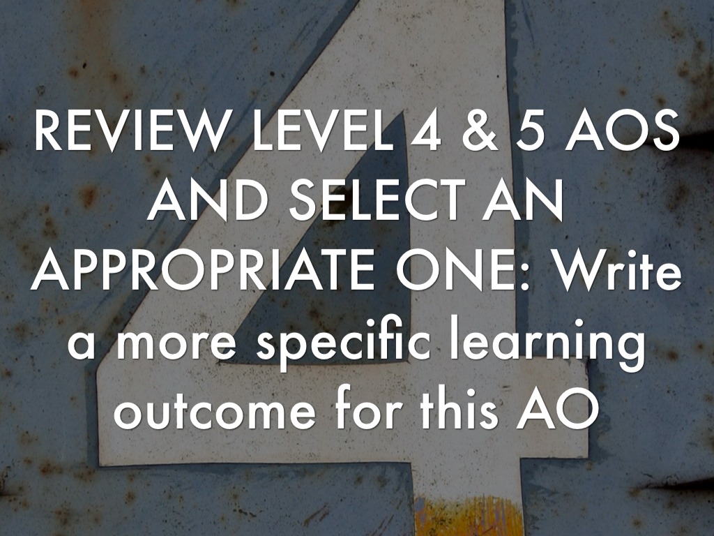 REVIEW LEVEL 4 & 5 AOS AND SELECT AN APPROPRIATE ONE: Write a more specific learning outcome for this AO