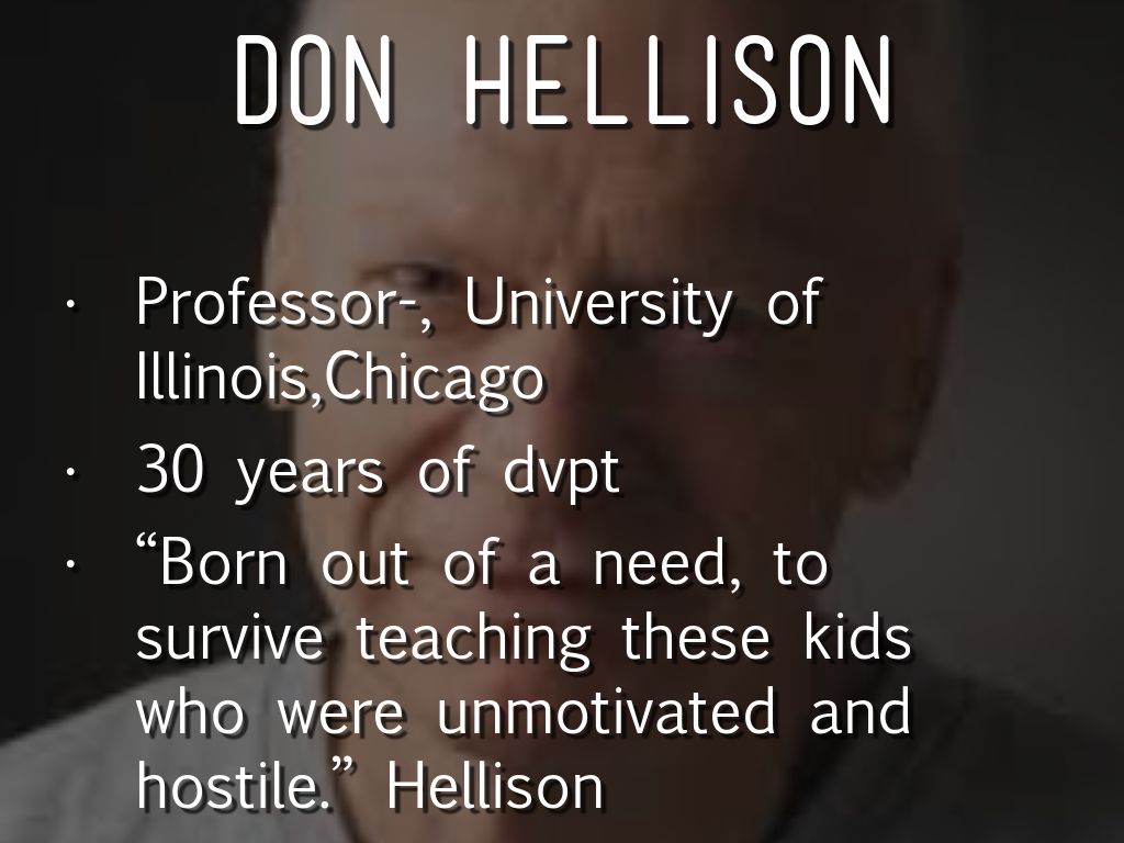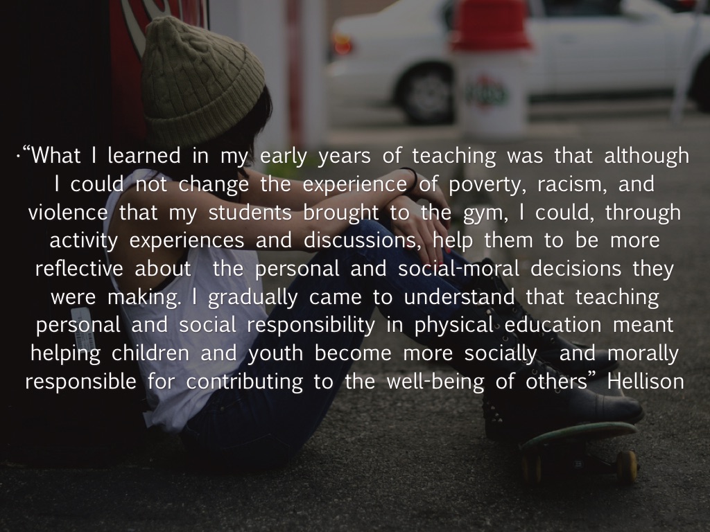 •“What I learned in my early years of teaching was that although I could not change the experience of poverty, racism, and violence that my students brought to the gym, I could, through activity experiences and discussions, help them to be more reflective about the personal and social-moral decisions they were making. I gradually came to understand that teaching personal and social responsibility in physical education meant helping children and youth become more socially and morally responsible for contributing to the well-being of others” Hellison