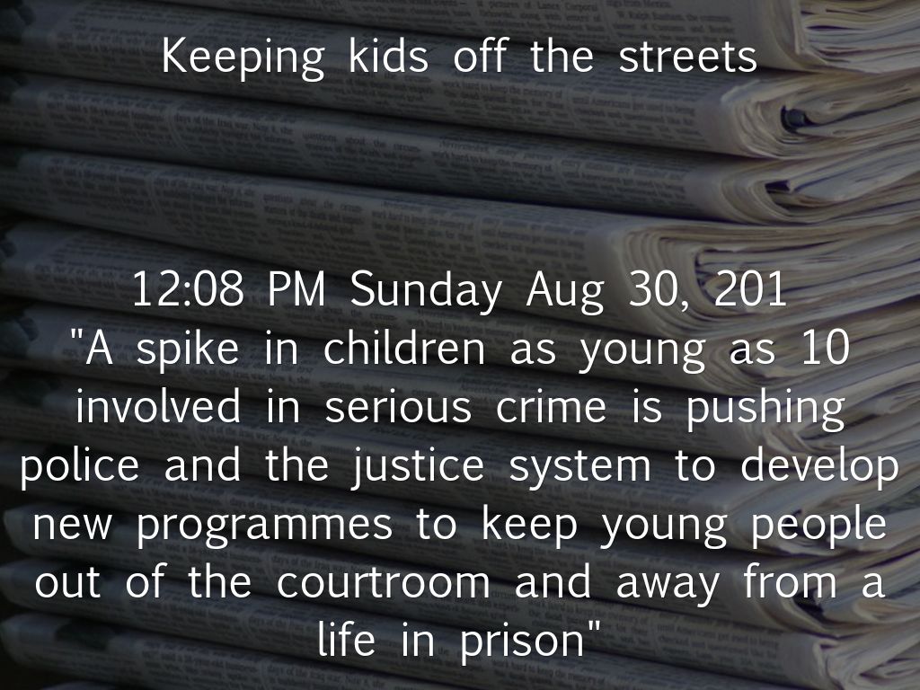 12:08 PM Sunday Aug 30, 201 "A spike in children as young as 10 involved in serious crime is pushing police and the justice system to develop new programmes to keep young people out of the courtroom and away from a life in prison"