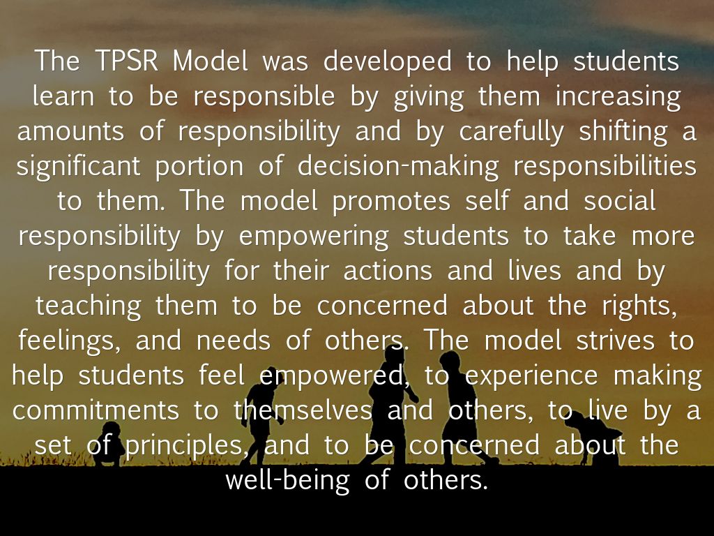 The TPSR Model was developed to help students learn to be responsible by giving them increasing amounts of responsibility and by carefully shifting a significant portion of decision-making responsibilities to them. The model promotes self and social responsibility by empowering students to take more responsibility for their actions and lives and by teaching them to be concerned about the rights, feelings, and needs of others. The model strives to help students feel empowered, to experience making commitments to themselves and others, to live by a set of principles, and to be concerned about the well-being of others.
