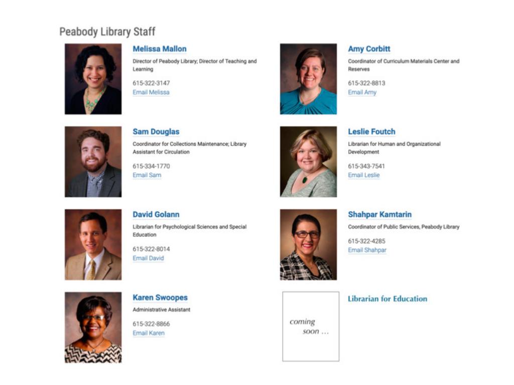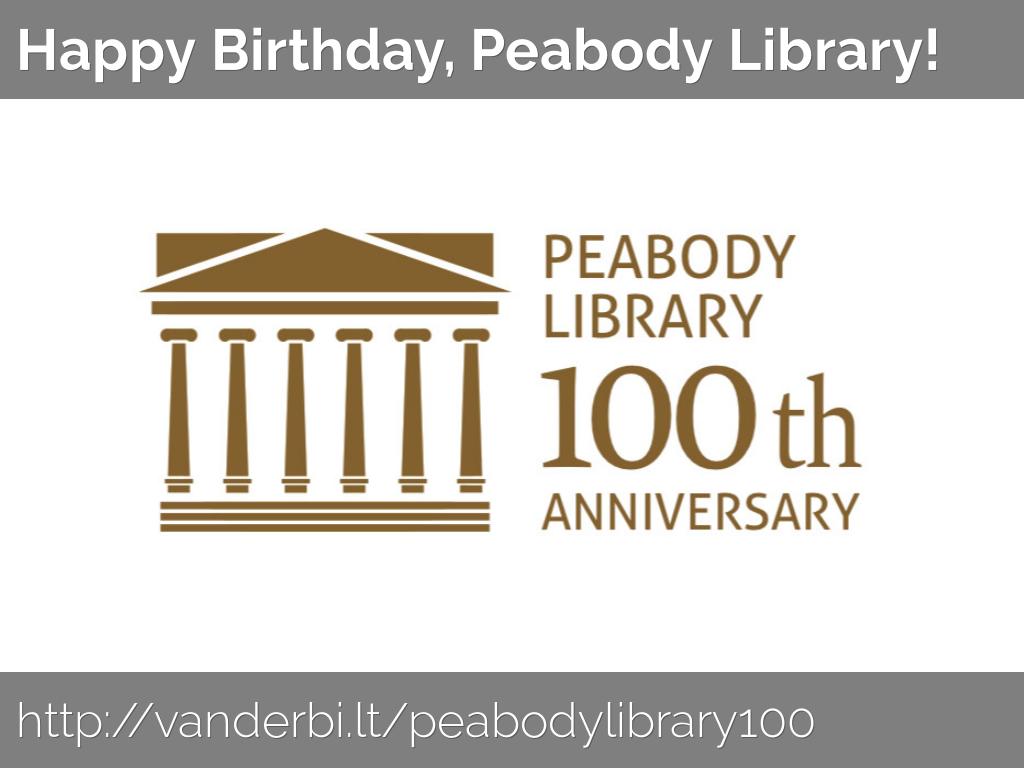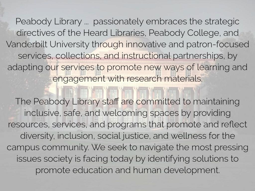 Peabody Library ... passionately embraces the strategic directives of the Heard Libraries, Peabody College, and Vanderbilt University through innovative and patron-focused services, collections, and instructional partnerships, by adapting our services to promote new ways of learning and engagement with research materials.