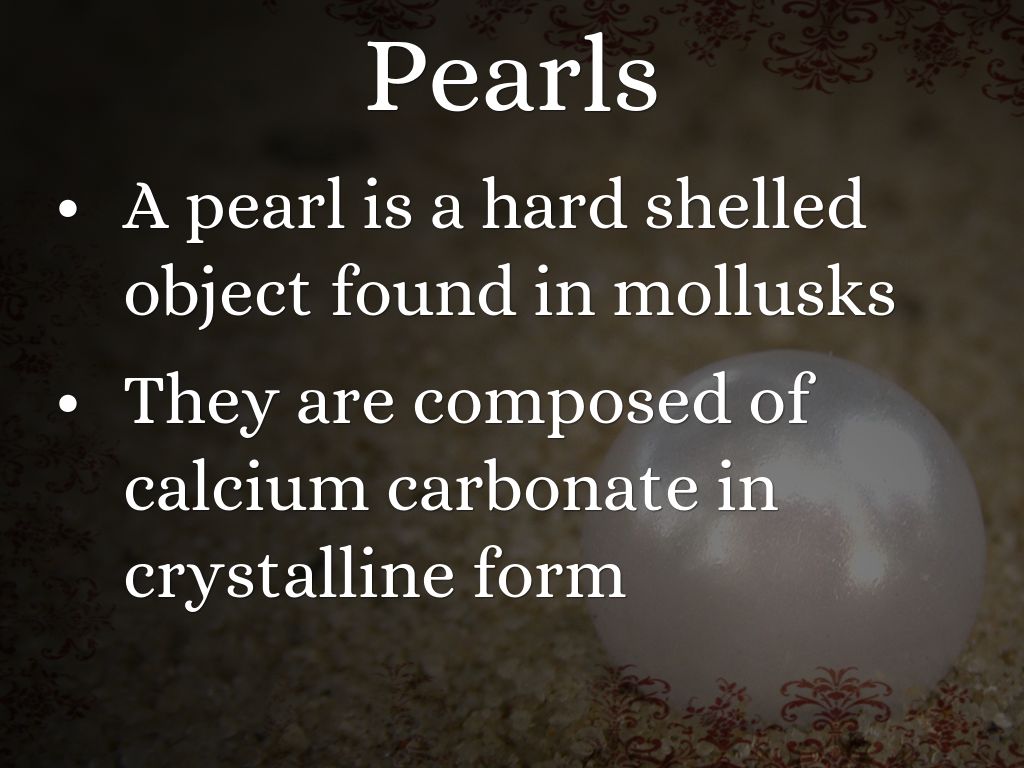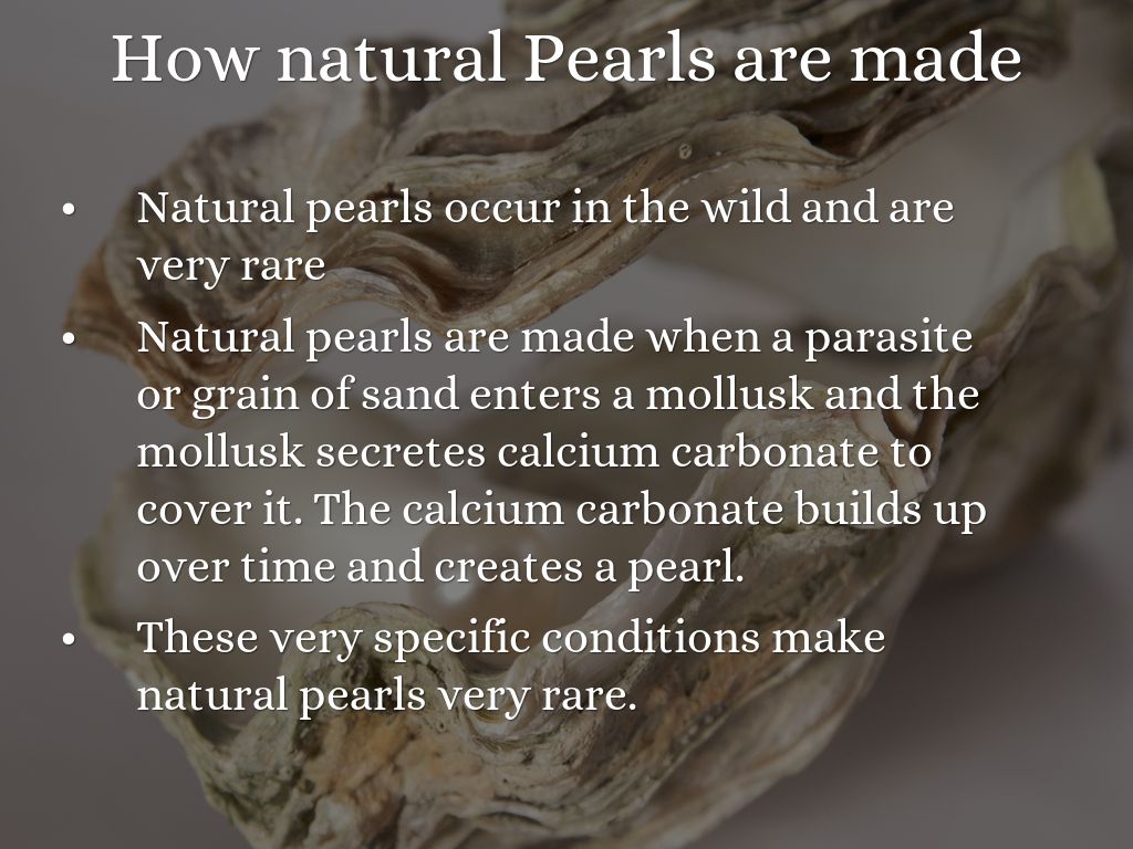 Natural pearls are made when a parasite or grain of sand enters a mollusk and the mollusk secretes calcium carbonate to cover it. The calcium carbonate builds up over time and creates a pearl.