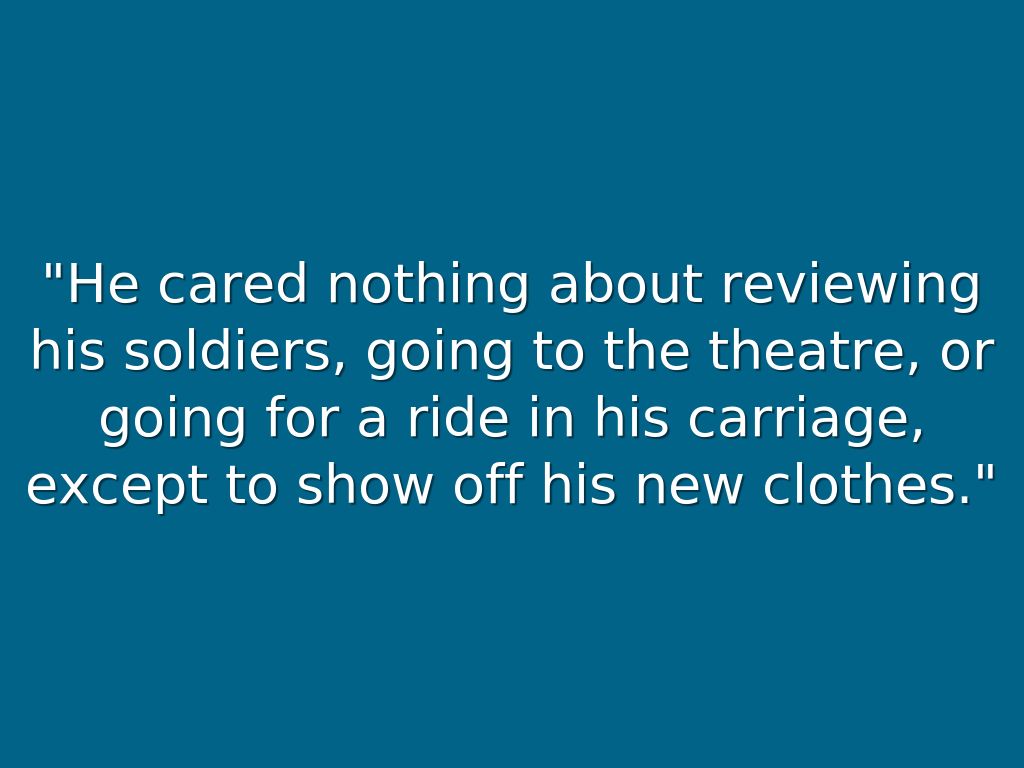 "He cared nothing about reviewing his soldiers, going to the theatre, or going for a ride in his carriage, except to show off his new clothes."
