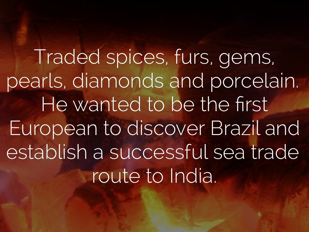 Traded spices, furs, gems, pearls, diamonds and porcelain. He wanted to be the first European to discover Brazil and establish a successful sea trade route to India.