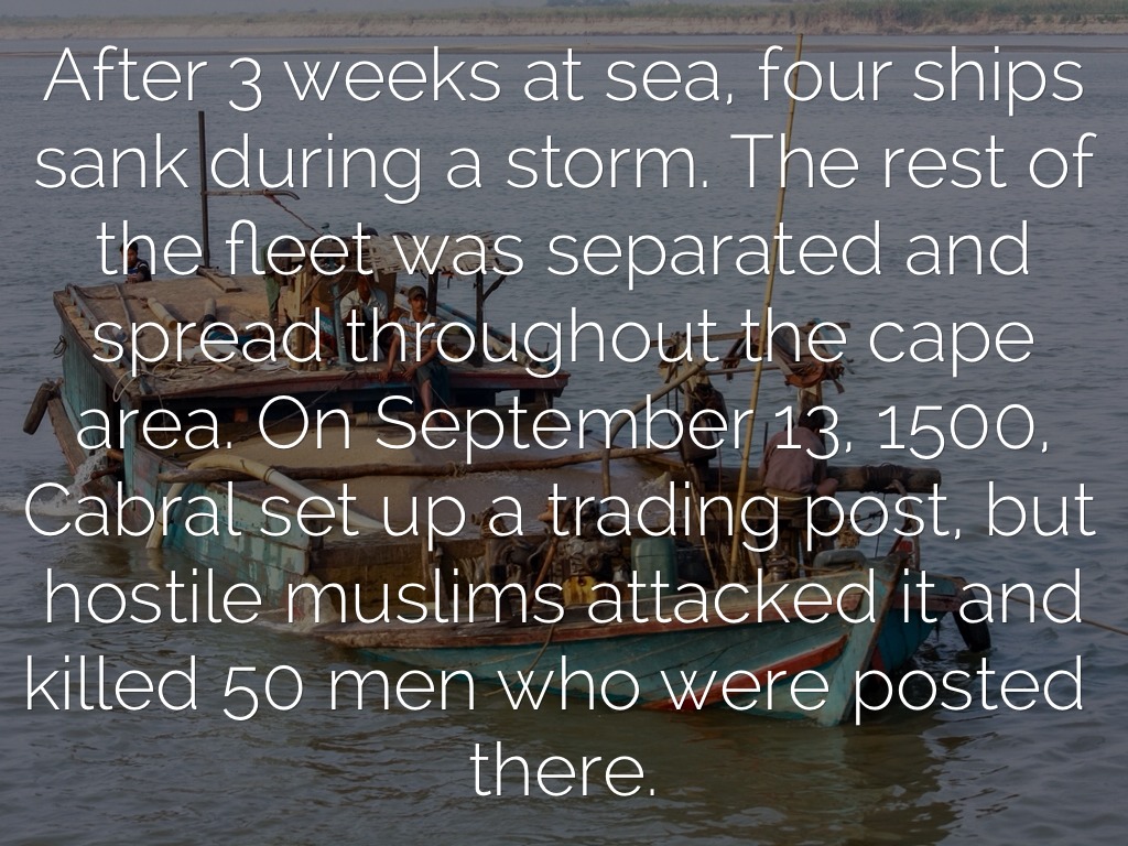 After 3 weeks at sea, four ships sank during a storm. The rest of the fleet was separated and spread throughout the cape area. On September 13, 1500, Cabral set up a trading post, but hostile muslims attacked it and killed 50 men who were posted there.
