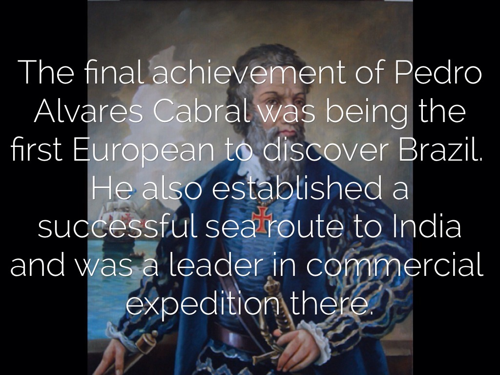 The final achievement of Pedro Alvares Cabral was being the first European to discover Brazil. He also established a successful sea route to India and was a leader in commercial expedition there.