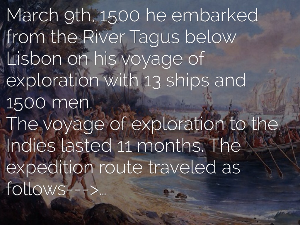March 9th, 1500 he embarked from the River Tagus below Lisbon on his voyage of exploration with 13 ships and