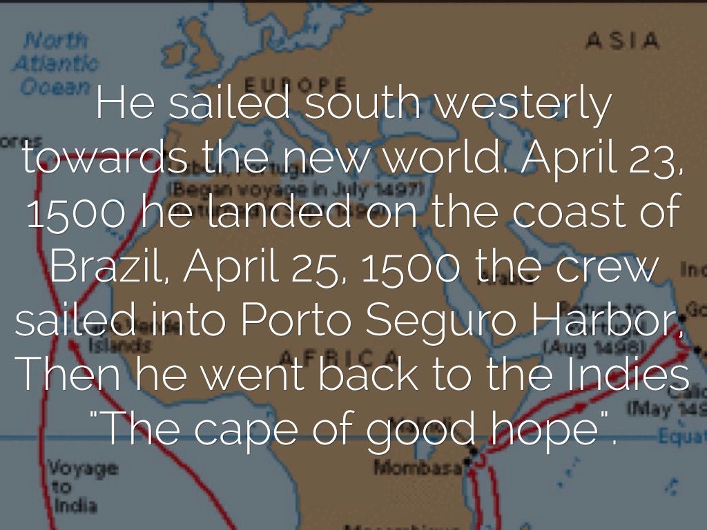 He sailed south westerly towards the new world. April 23, 1500 he landed on the coast of Brazil, April 25, 1500 the crew sailed into Porto Seguro Harbor, Then he went back to the Indies "The cape of good hope".