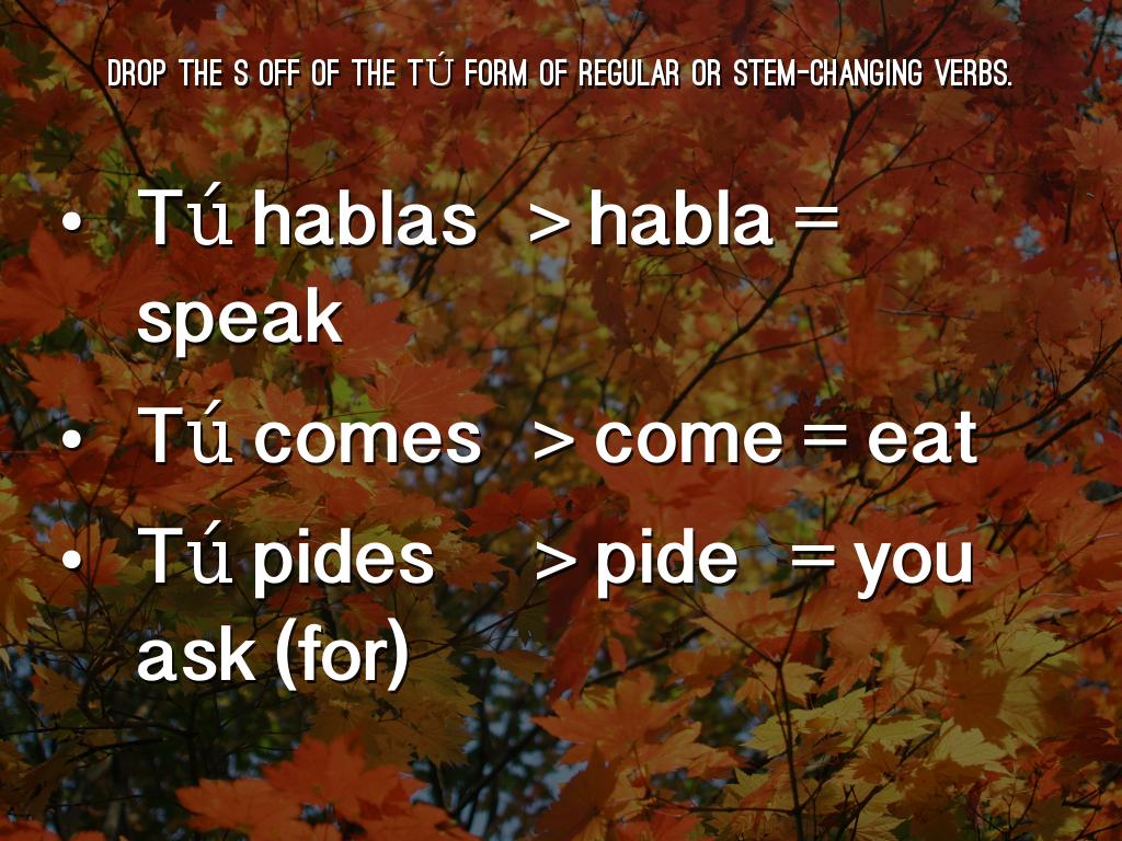 DROP THE S OFF OF THE TÚ FORM OF REGULAR OR STEM-CHANGING VERBS.