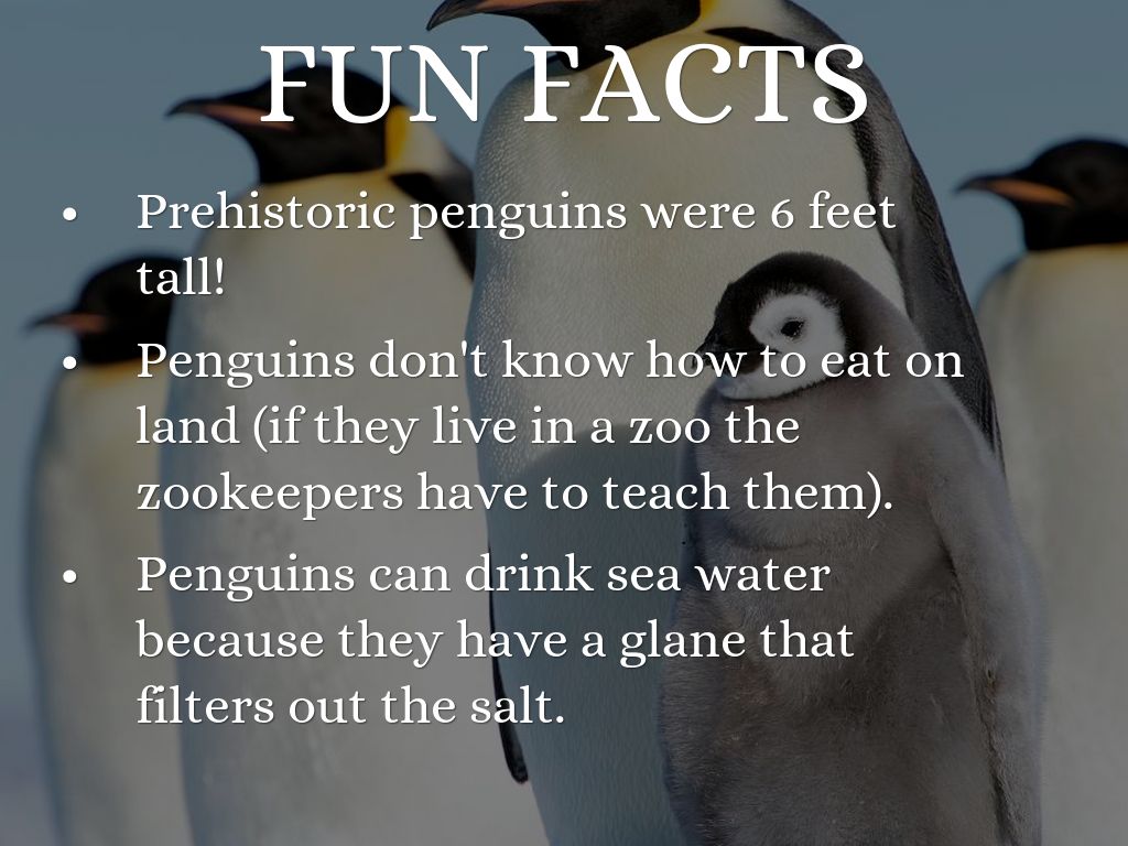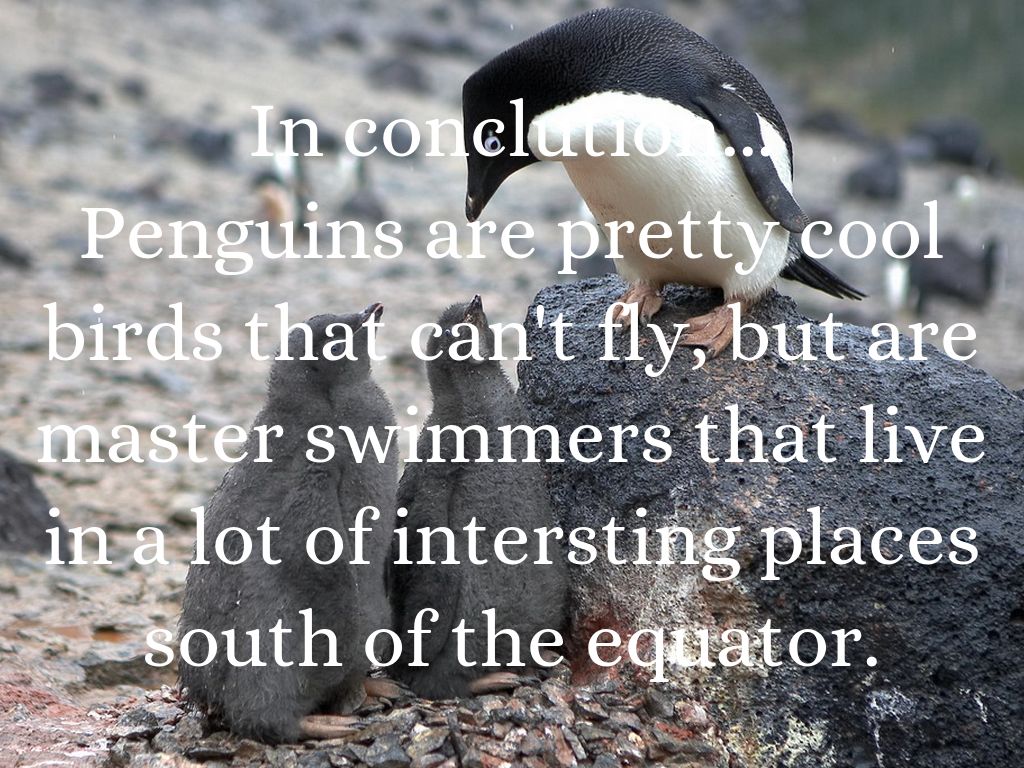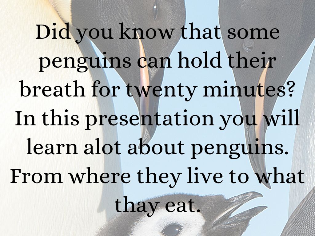 Did you know that some penguins can hold their breath for twenty minutes? In this presentation you will learn alot about penguins. From where they live to what thay eat.