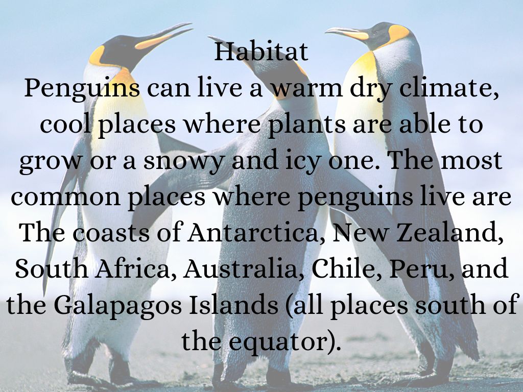 Habitat Penguins can live a warm dry climate, cool places where plants are able to grow or a snowy and icy one. The most common places where penguins live are The coasts of Antarctica, New Zealand, South Africa, Australia, Chile, Peru, and the Galapagos Islands (all places south of the equator).