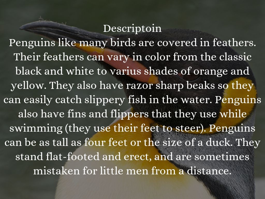Descriptoin Penguins like many birds are covered in feathers. Their feathers can vary in color from the classic black and white to varius shades of orange and yellow. They also have razor sharp beaks so they can easily catch slippery fish in the water. Penguins also have fins and flippers that they use while swimming (they use their feet to steer). Penguins can be as tall as four feet or the size of a duck. They stand flat-footed and erect, and are sometimes mistaken for little men from a distance.