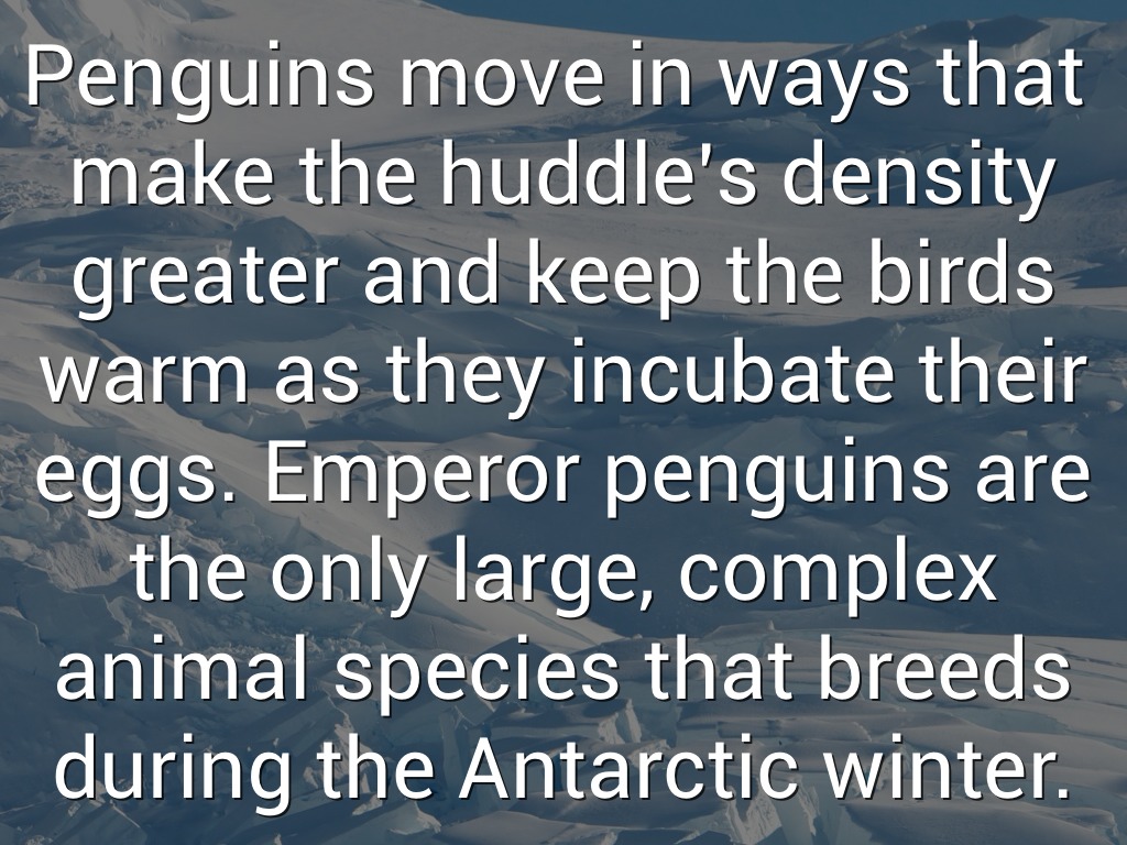 Penguins move in ways that make the huddle’s density greater and keep the birds warm as they incubate their eggs. Emperor penguins are the only large, complex animal species that breeds during the Antarctic winter.