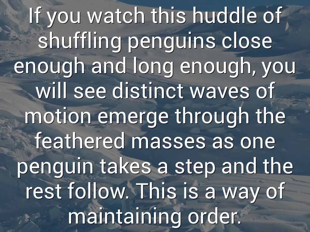 If you watch this huddle of shuffling penguins close enough and long enough, you will see distinct waves of motion emerge through the feathered masses as one penguin takes a step and the rest follow. This is a way of maintaining order.