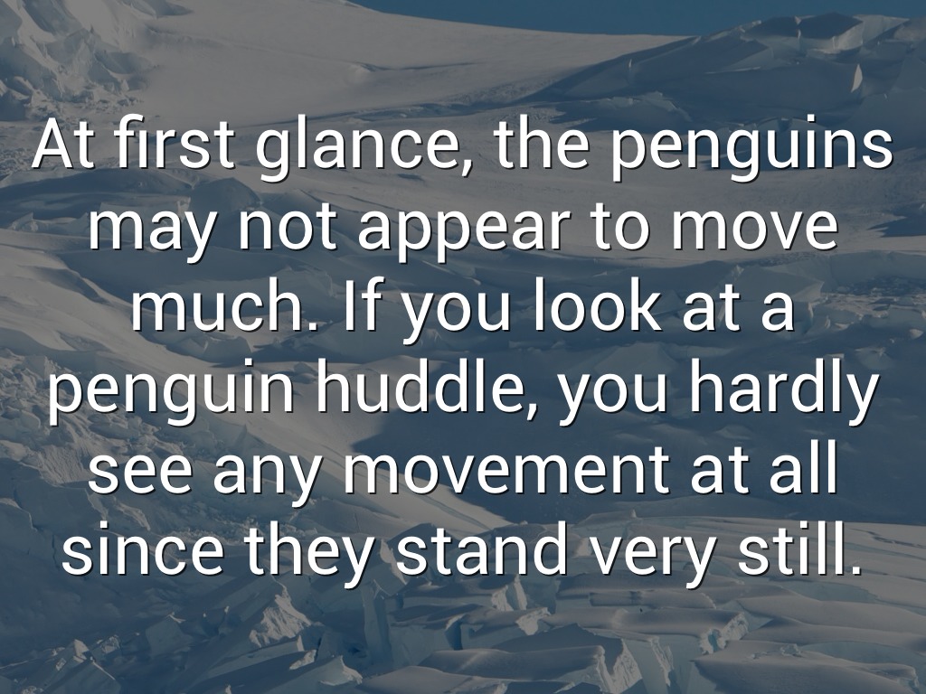 At first glance, the penguins may not appear to move much. If you look at a penguin huddle, you hardly see any movement at all since they stand very still.