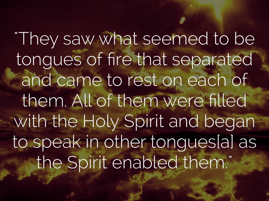 "They saw what seemed to be tongues of fire that separated and came to rest on each of them. All of them were filled with the Holy Spirit and began to speak in other tongues[a] as the Spirit enabled them."