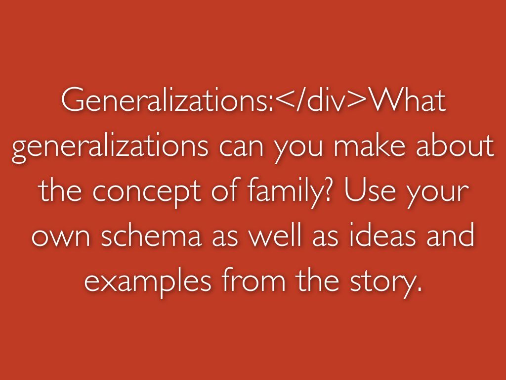 Generalizations:What generalizations can you make about the concept of family? Use your own schema as well as ideas and examples from the story.