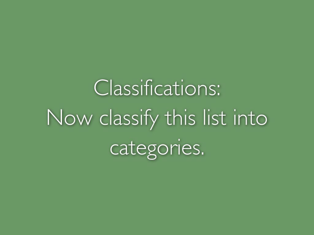 Now classify this list into categories.