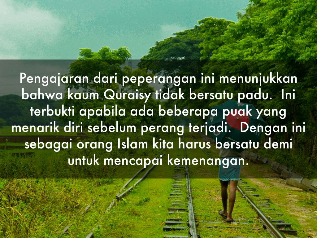 Pengajaran dari peperangan ini menunjukkan bahwa kaum Quraisy tidak bersatu padu. Ini terbukti apabila ada beberapa puak yang menarik diri sebelum perang terjadi. Dengan ini sebagai orang Islam kita harus bersatu demi untuk mencapai kemenangan.