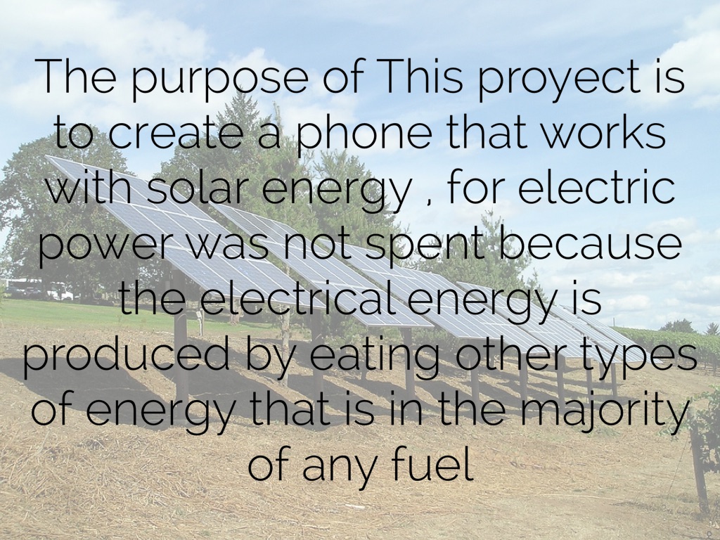 The purpose of This proyect is to create a phone that works with solar energy , for electric power was not spent because the electrical energy is produced by eating other types of energy that is in the majority of any fuel