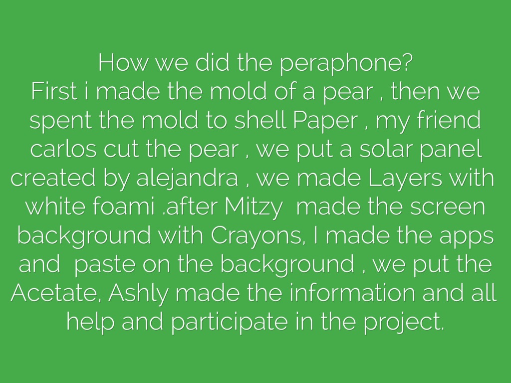 First i made the mold of a pear , then we spent the mold to shell Paper , my friend carlos cut the pear , we put a solar panel created by alejandra , we made Layers with white foami .after Mitzy made the screen background with Crayons, I made the apps and paste on the background , we put the Acetate, Ashly made the information and all help and participate in the project.