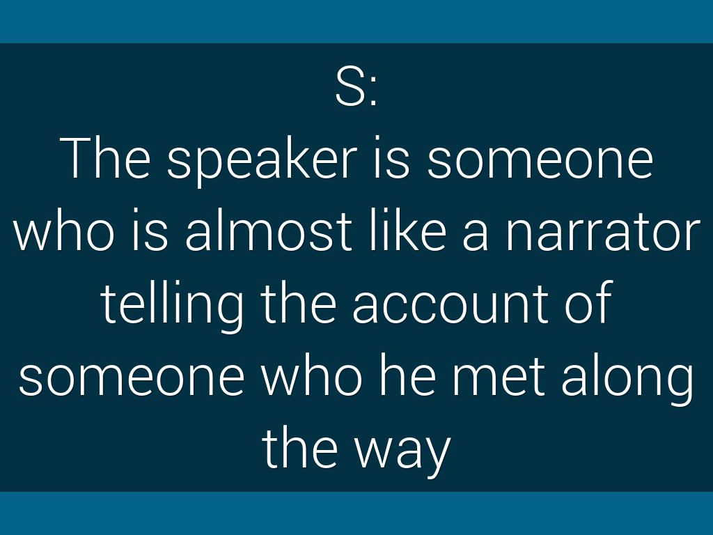 The speaker is someone who is almost like a narrator telling the account of someone who he met along the way