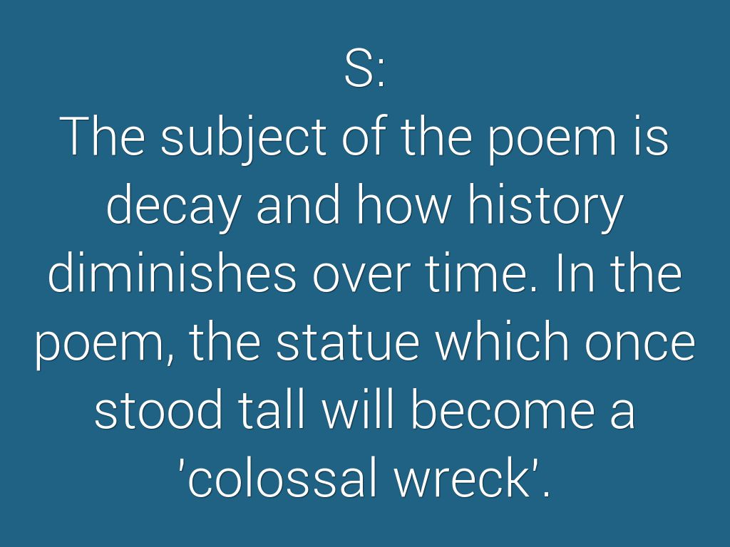 The subject of the poem is decay and how history diminishes over time. In the poem, the statue which once stood tall will become a 'colossal wreck'.