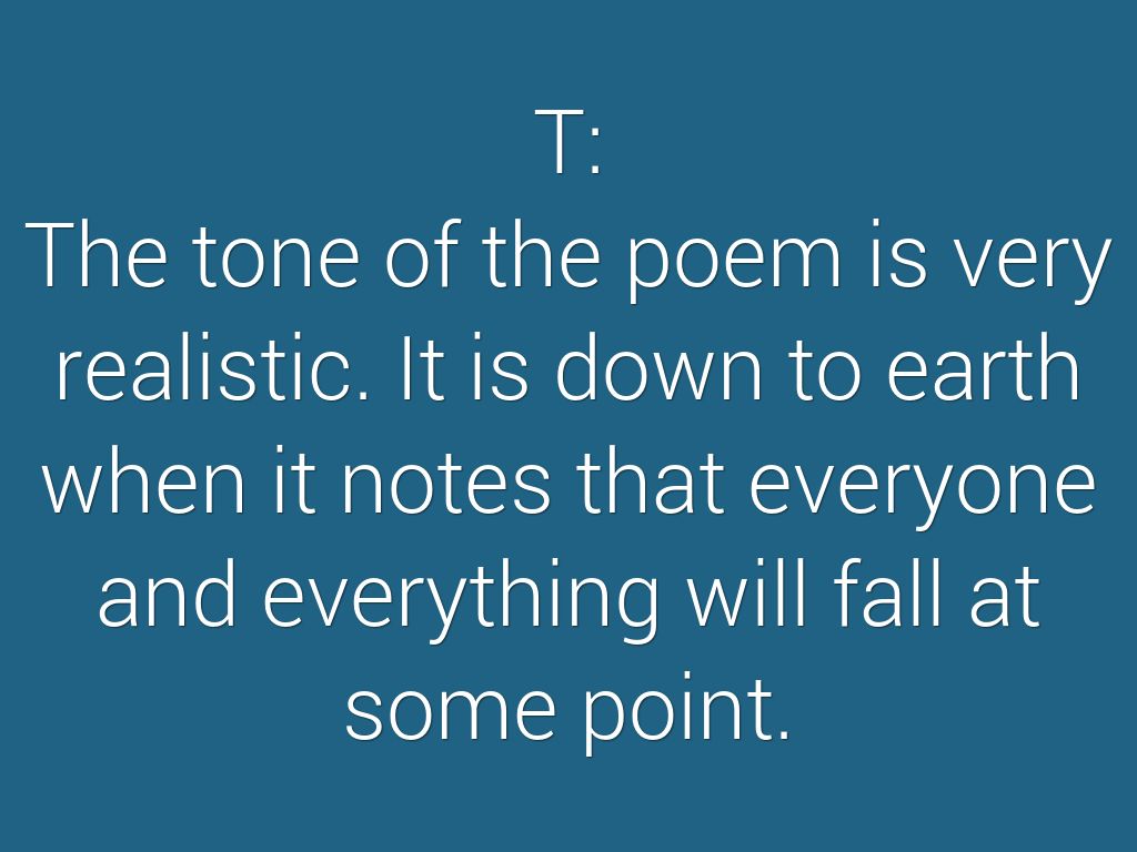 The tone of the poem is very realistic. It is down to earth when it notes that everyone and everything will fall at some point.