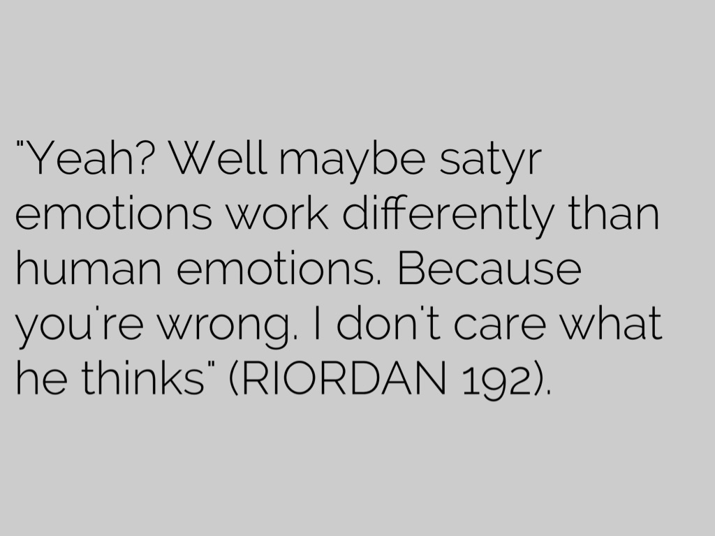 "Yeah? Well maybe satyr emotions work differently than human emotions. Because you're wrong. I don't care what he thinks" (RIORDAN 192).