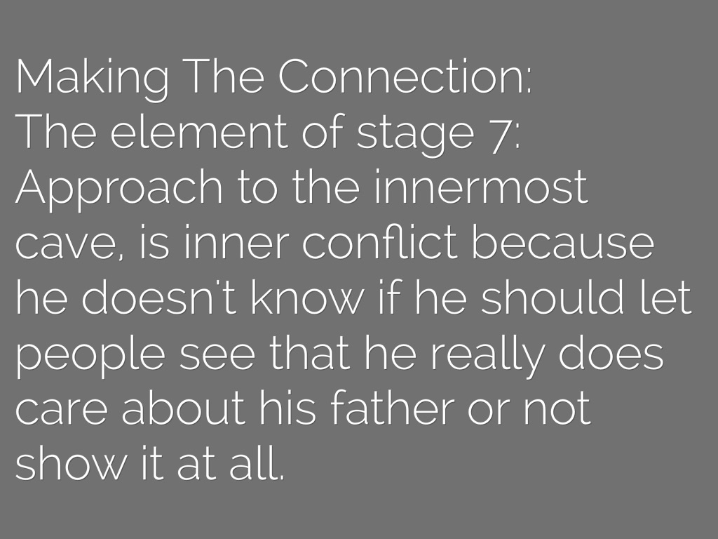 Making The Connection: The element of stage 7: Approach to the innermost cave, is inner conflict because he doesn't know if he should let people see that he really does care about his father or not show it at all.