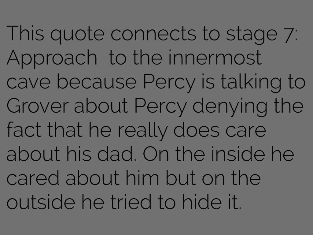 This quote connects to stage 7: Approach to the innermost cave because Percy is talking to Grover about Percy denying the fact that he really does care about his dad. On the inside he cared about him but on the outside he tried to hide it.