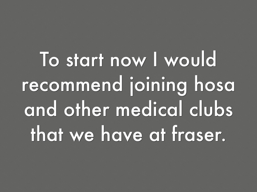 To start now I would recommend joining hosa and other medical clubs that we have at fraser.