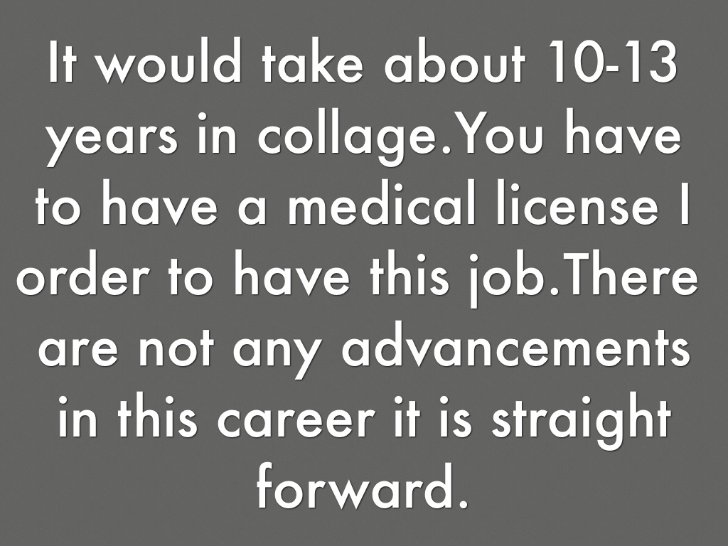 It would take about 10-13 years in collage.You have to have a medical license I order to have this job.There are not any advancements in this career it is straight forward.